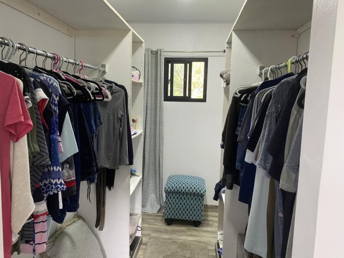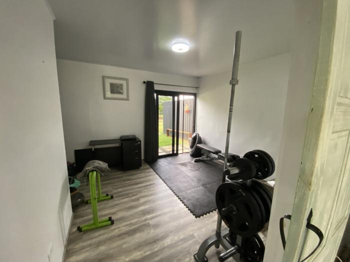 cuenta con una amplia sala con cocina abierta, dormitorio principal con vestidor y baño privado, un segundo dormitorio actualmente utilizado como gimnasio, un segundo baño completo, una pequeña oficina en casa, despensa, lavandería con lavadora y secadora, y un práctico estacionamiento techado.